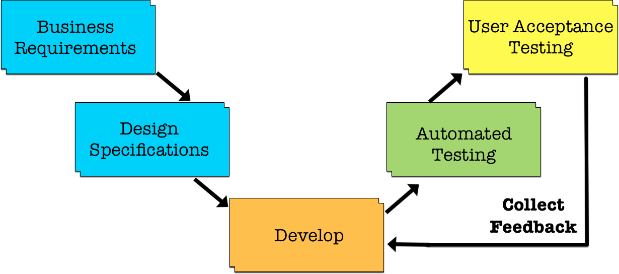 In the classic waterfall development model, different stages of work are expected to occur sequentially. In this scenario, it’s easy to see where UAT fits—after your automated testing, but just before your full release.