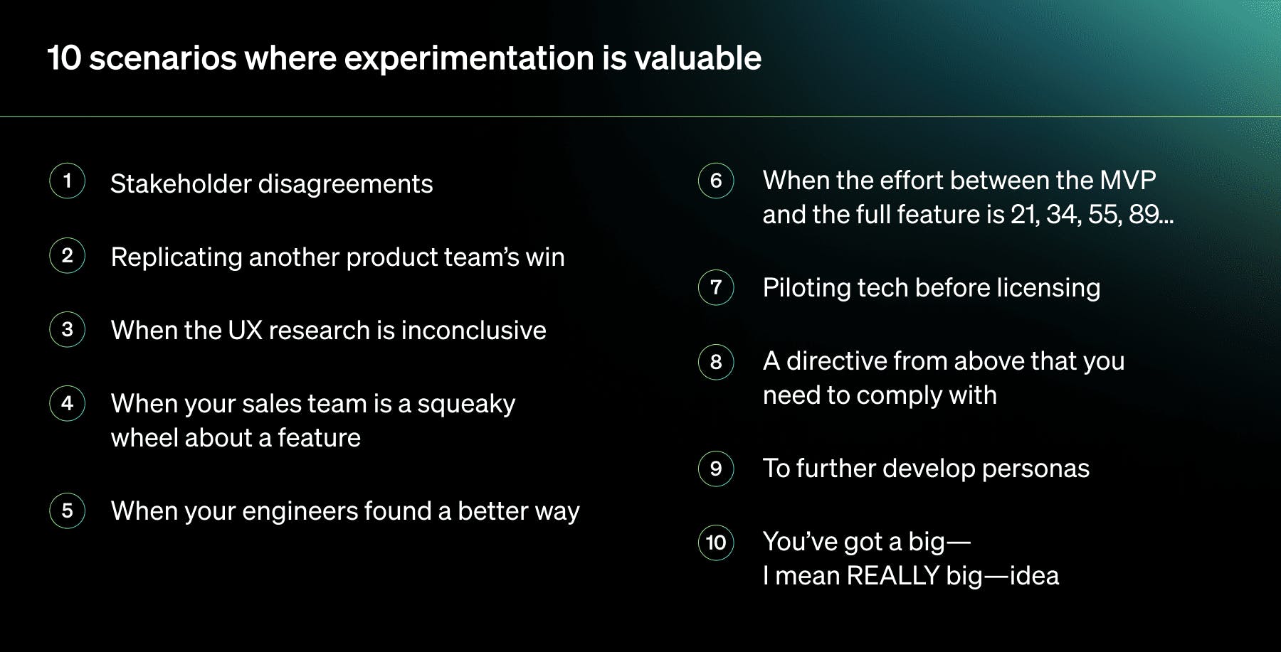 We’ve compiled a list of scenarios that represent some great opportunities for product managers to consider experimenting. This isn’t meant to be exhaustive of all situations, but hopefully it’s some good food for thought.