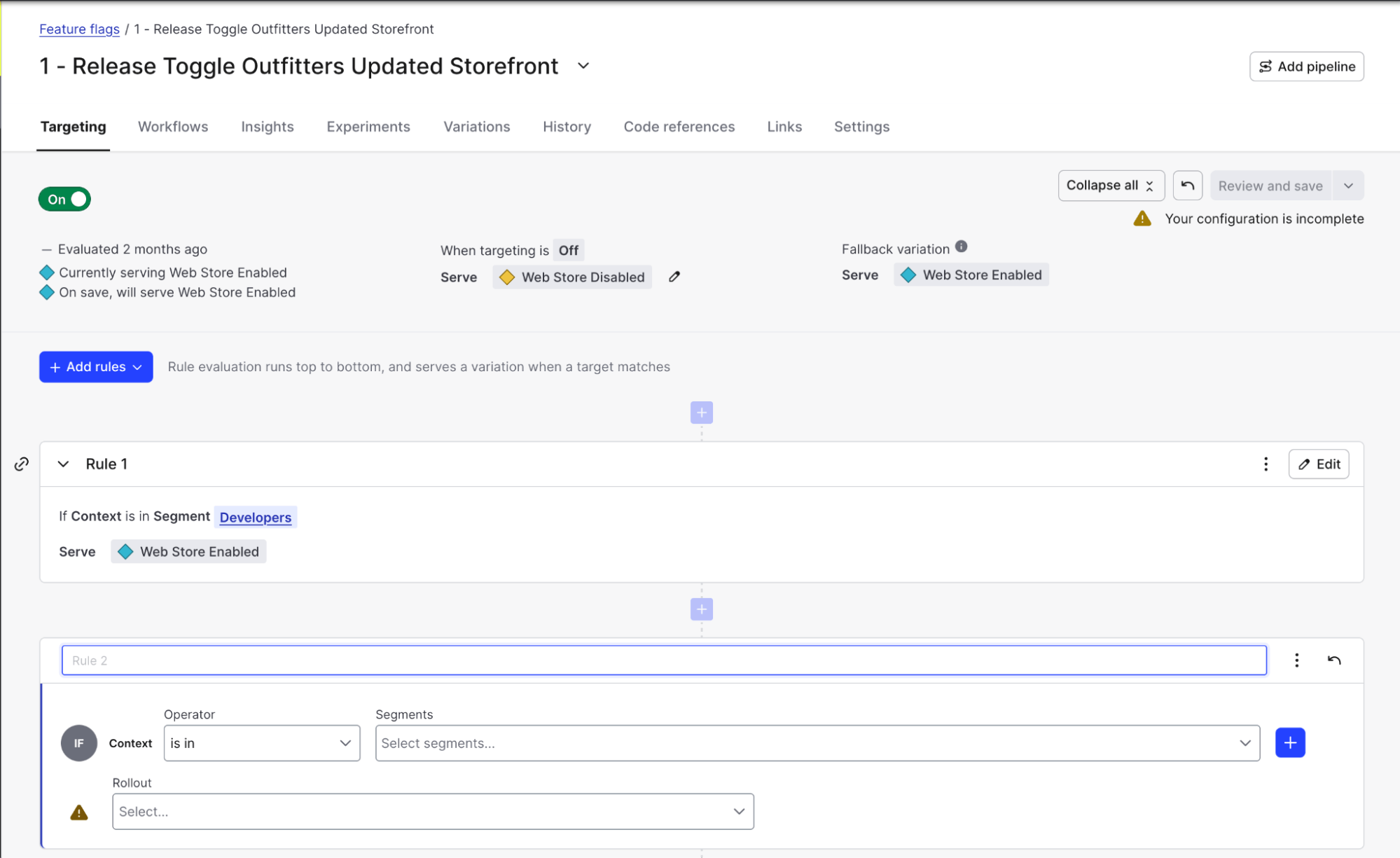 A feature flag in LaunchDarkly with one targeting rule created and adding a second.