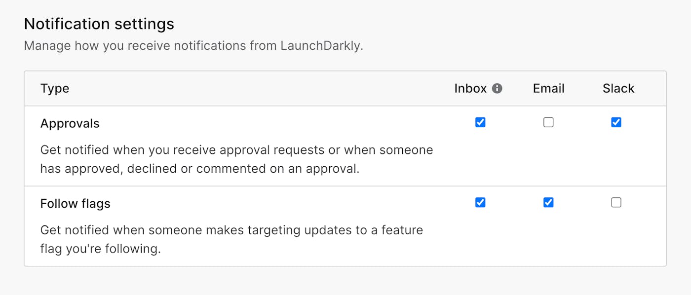 Now, within LaunchDarkly, customers can control what notifications they’d like to receive (i.e flag updates, approvals) and how they’d like to receive them (i.e. in-app, Slack, Microsoft Teams, or email).