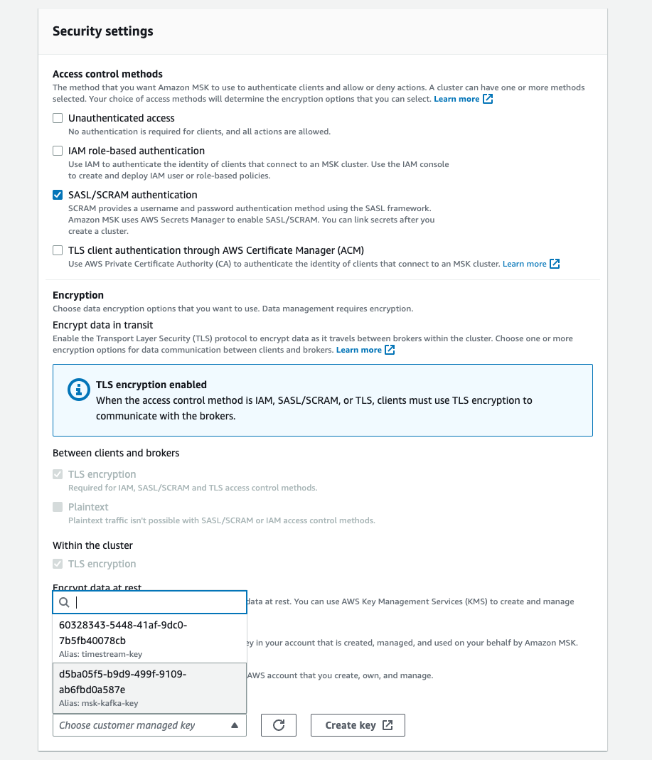 For SASL/SCRAM authentication, you’ll set the user/password after the cluster is created. For encryption, you’ll want to use your own key created in AWS KMS.