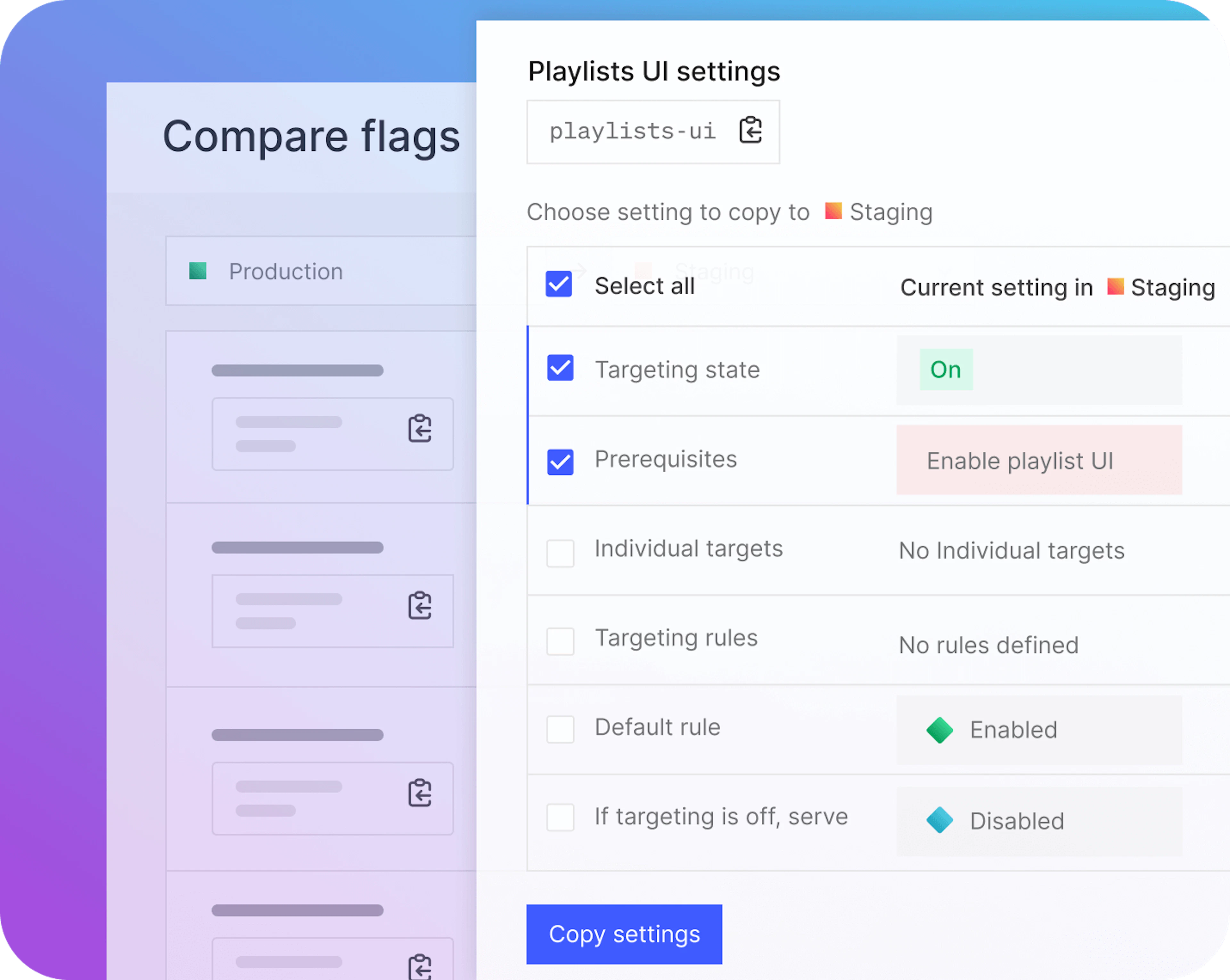 Compare feature flag configuration settings, including targets and variations, between flags set up in two different environments. For example, compare and clone rules from a staging environment into a production environment, without potentially costly manual errors.