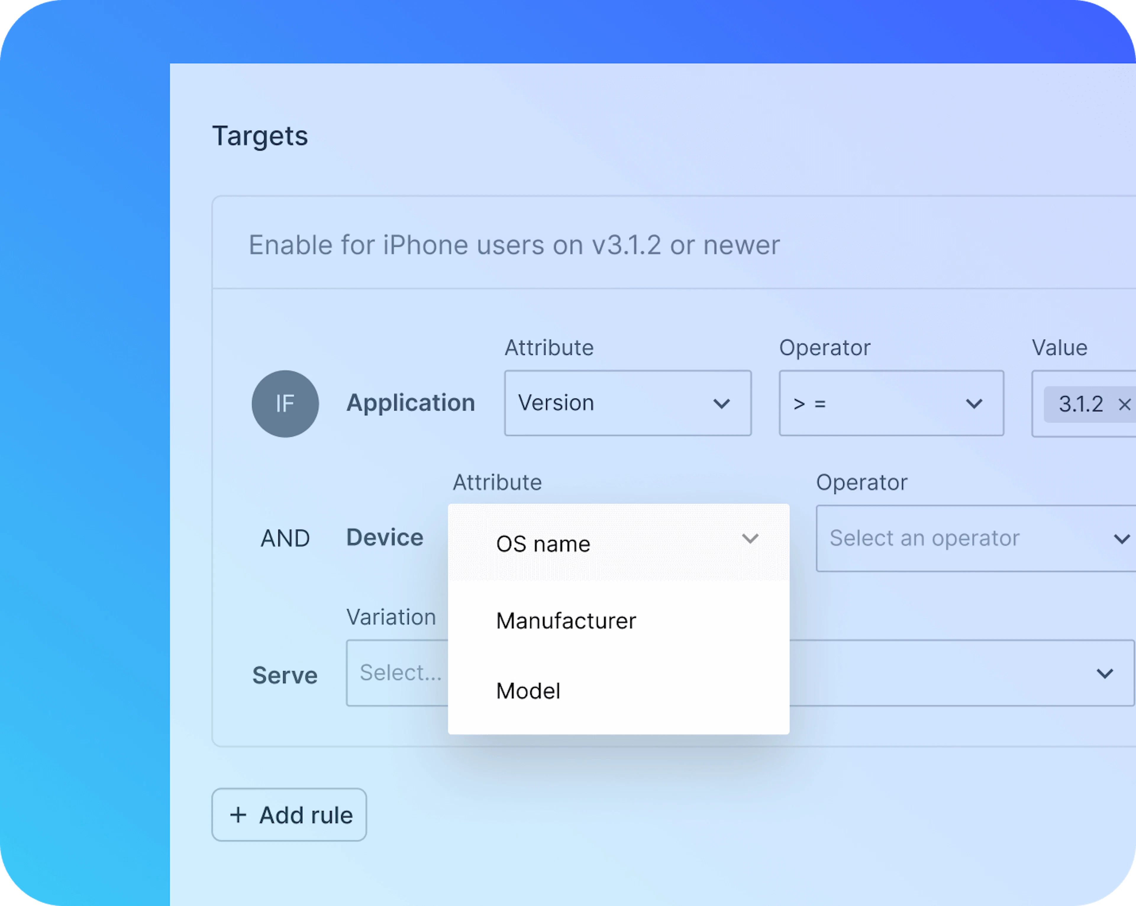 Targeting isn’t just about users. LaunchDarkly’s context-based model allows you to create targeting rules that are as simple or as complex as the needs of your application require. Target users, devices, environments, company, location or just about anything else.